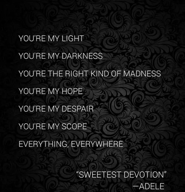 45. „Du bist mein Licht, du bist meine Dunkelheit, du bist die richtige Art von Wahnsinn, du bist meine Hoffnung, du bist meine Verzweiflung, du bist mein Horizont, alles überall.“ – Adele „Süßeste Hingabe“