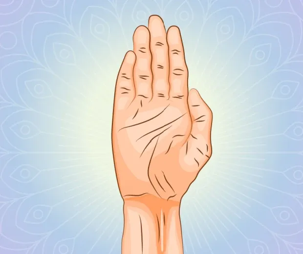 Dieses Symbol erreichen Sie, indem Sie die Spitze Ihres Daumens mit der Zeigefingerspitze berühren und die anderen drei Finger mit der Handfläche nach oben gerade halten. Es ist eines der beliebtesten Mudras.