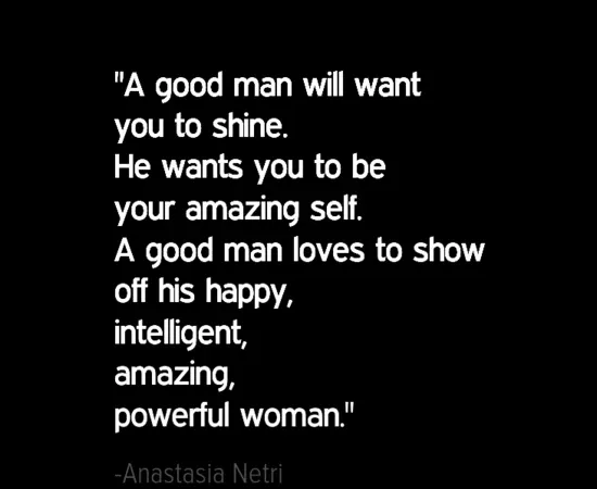 10. „Ein guter Mann möchte, dass du strahlst.“ Er möchte, dass du dein erstaunliches Selbst bist. „Ein guter Mann liebt es, seine glückliche, intelligente, unglaublich starke Frau zur Schau zu stellen.“ — Anastasia Netri