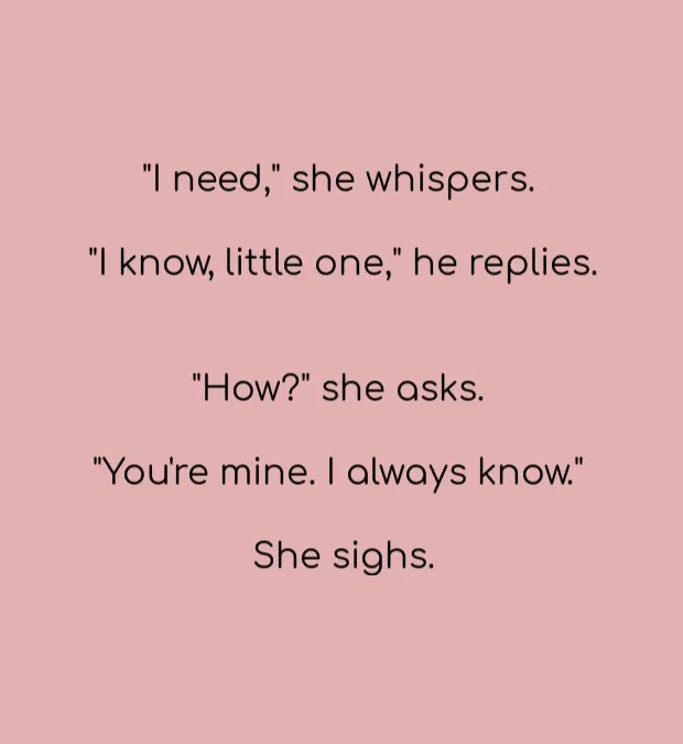 2. „Ich brauche“, flüstert sie. „Ich kenne den Kleinen“, antwortet er. 'Wie?' sie fragt. „Du gehörst mir.“ Ich weiß es immer.' Sie seufzt.'