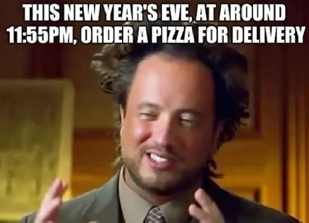 18. „An Silvester gegen 11:55 Uhr eine Pizza zum Liefern bestellen.“ Wenn es ankommt, sagen Sie dem Fahrer: „Das habe ich vor einem Jahr bestellt!“