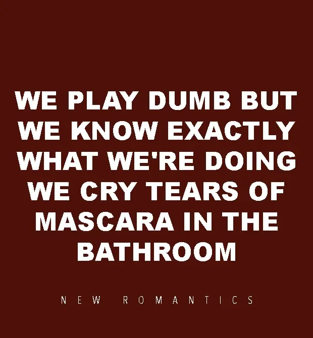 Diese Zeile von „New Romantics“ sorgt für Mädelsabend-Feeling, wenn Sie so viel Spaß mit Ihren Freundinnen haben, dass die Suche nach Liebe das Allerwichtigste für Sie ist – weil Sie in der Liebe Ihrer Freunde schwelgen!