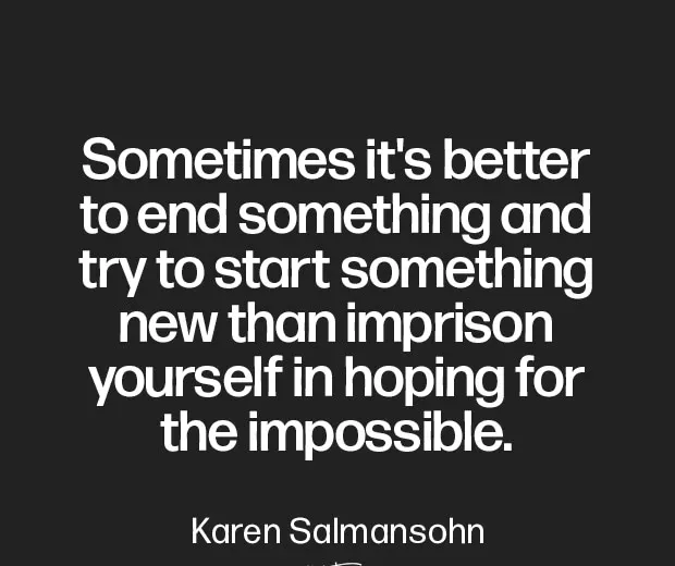19. Manchmal ist es besser, etwas zu beenden und zu versuchen, etwas Neues zu beginnen, als sich in der Hoffnung auf das Unmögliche gefangen zu halten. – Karen Salmansohn